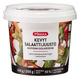 Pirkka kevyt salaattijuusto kuutioina suolavedessä 365g/200g laktoositon sisältää 180 kilokaloria per 100g. Koko 200g pakkaus sisältää yhteensä 360 kcal.
