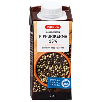 Pirkka laktoositon pippurikerma 15% 2 dl on valmistettu Suomessa.