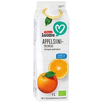 Pirkka Luomu appelsiinitäysmehu 1 l sisältää seuraavia ainesosia: