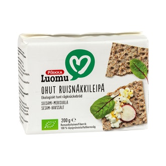 Pirkka Luomu ohut ruisnäkkileipä seesami-merisuola 200g sisältää seuraavia ainesosia:
