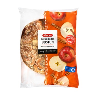Pirkka omena-kanelibostonpulla 350g on valmistettu Suomessa.