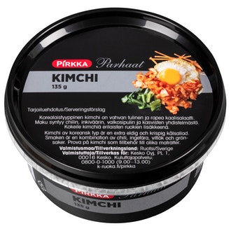 Pirkka Parhaat kimchi 135g sisältää 120 kilokaloria per 100g. Koko 135g pakkaus sisältää yhteensä 162 kcal.