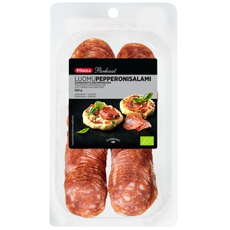 Pirkka Parhaat luomupepperonisalami 100g sisältää seuraavia ainesosia: