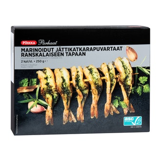 Mitä olet mieltä tuotteesta Pirkka Parhaat marinoidut jättikatkarapuvartaat ranskalaiseen tapaan 2kpl/250g ASC pakaste? Jaa kokemuksesi ja .