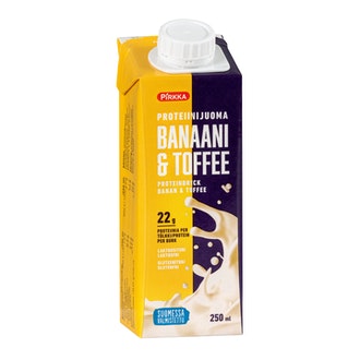 Pirkka proteiinijuoma 250ml banaani-toffee laktoositon on valmistettu Suomessa.