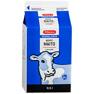 Pirkka suomalainen kevytmaito 0,5l on valmistettu Suomessa.