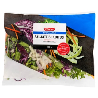 Pirkka suomalainen salaattisekoitus 160g on valmistettu Suomessa.