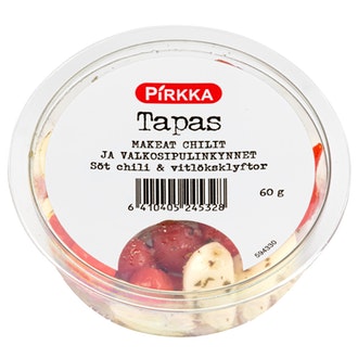 Pirkka Tapas makeat chilit & valkosipulinkynnet 60g sisältää seuraavia ainesosia: