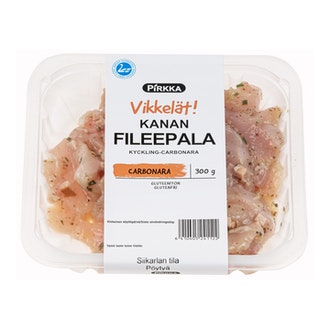 Pirkka Vikkelät kanan fileepala carbonara 300g on valmistettu Suomessa.