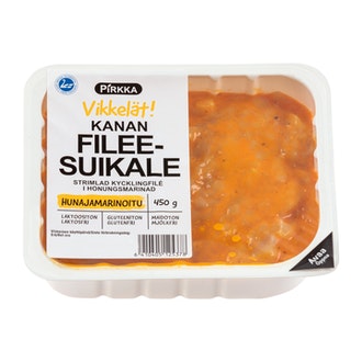 Pirkka Vikkelät kanan fileesuikale hunajamarinoitu 450g on valmistettu Suomessa.