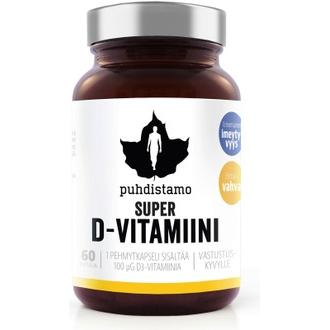 Puhdistamon Super D-vitamiini on vahva 100 ug D3-vitamiinivalmiste. Pehmytkapseliin pakattu turskanmaksaöljy sisältää luontaisesti A-vitamiinia ja D-vitamiinia, minkä lisäksi sitä on täydennetty lampaanvillan lanoliiniperäisellä kolekalsiferolilla. Luonnossa D-vitamiinia esiintyy eniten kalan rasvassa, joten Super D-vitamiiniin on valittu laadukas kalaöljy tuotteen pohjaksi. Luonnollinen kalaöljy varmistaa D-vitamiinin erinomaisen imeytymisen. D-vitamiini edistää lihastoiminnan, luuston ja immuunijärjestelmän normaalia toimintaa. Täysin täyteaineeton, gluteeniton, maidoton ja luonnollinen. Kehitetty ja pakattu Suomessa. Raaka-aineen alkuperämaa Ranska.