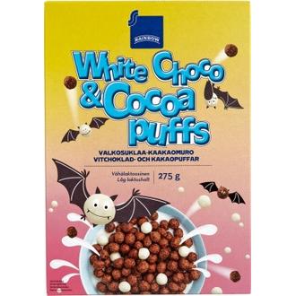 Maissi 41% (EU), valkosuklaamurot 18% (riisi, sokeri, kaakaovoi* (Afrikka), MAITOJAUHE, HERAJAUHE, suola, aromi), sokeri, riisi, TÄYSJYVÄVEHNÄJAUHO, ruokosokeri, kaakaojauhe* 3, 7% (Afrikka), fruktoosi, suklaajauhe 1, 6% (sokeri, kaakaomassa* (Afrikka), kaakaojauhe* (Afrikka), vanilliini), inverttisokeri, glukoosi, suola, vitamiinit (E-vitamiini, niasiini, pantoteenihappo, B6-vitamiini, riboflaviini, tiamiini, B12-vitamiini, foolihappo), maltodekstriini, vanilliini. |Saattaa sisältää pieniä määriä soijaa, cashewpähkinää, hasselpähkinää, mantelia, pekaanipähkinää ja seesaminsiemeniä. |Pakattu suojakaasuun. |Tuotteessa on 4, 5% valkosuklaata. |* Rainforest Alliance -sertifioitu, ra. org|Rainforest Alliance edustaa kestävän kehityksen mukaisia viljelykäytänteitä ja parempaa tulevaisuutta ihmisille ja luonnolle. www. ra. org