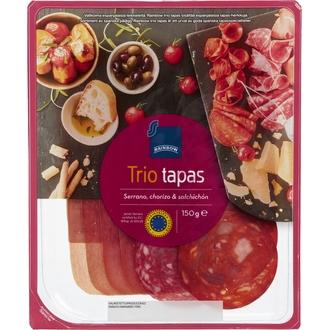 Serrano, ilmakuivattu kinkku 60 g, Chorizo, ilmakuivattu kestomakkara 45 g, Salchichón ilmakuivattu kestomakkara 45g.