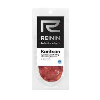 Karitsan kylmäsavupaistileike 60g. Kokolihatuote. Laktoositon. Gluteeniton. Karitsanliha (kasvatettu ja teurastettu: Suomi), suola, mausteet (valkosipuli, korianteri, rosmariini), aromi, dekstroosi, hapettumisenestoaine (E301), mausteuutteet (mustapippuri), säilöntäaine (E250). 100 grammaan tuotetta, on käytetty 140 g lihaa. Voimakassuolainen.