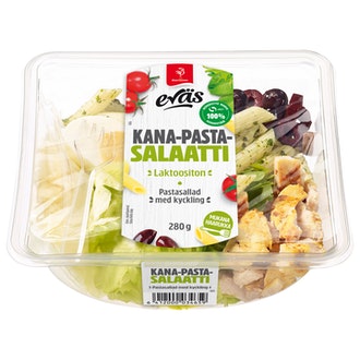 Saarioinen Eväs kana-pastasalaatti 280g sisältää 160 kilokaloria per 100g. Koko 280g pakkaus sisältää yhteensä 448 kcal.