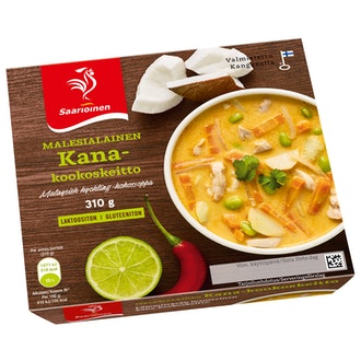 Saarioinen malesialainen kana-kookoskeitto 310g on valmistettu Suomessa.
