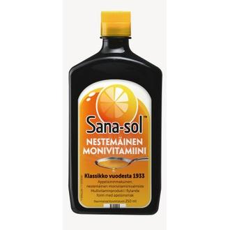- Suomen suosituin nestemäinen monivitamiinivalmiste Sana-sol sisältää päivän kaikki A-, B-, C-, D- ja E-vitamiinit yhdessä lusikallisessa. Appelsiininmakuinen neste tekee hyvää ja maistuu myös hyvältä! Päiväannos 10 ml.
