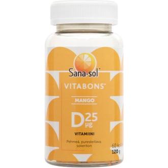 Sana-sol Vitabons on pehmeä ja pureskeltava D-vitamiini. Sisältää 25 µg D-vitamiinia. Vitabons D-vitamiini on mangonmakuinen, sokeriton ja tähden muotoinen. Suositeltava vuorokausiannos aikuisille 1-2 kpl/vrk.