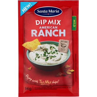 Santa Maria Dip Mix American Ranch on raikas, yrttien ja valkosipulin makuinen mausteseos, joka tekee kermaisen dipin tarjoilusta helppoa. Ranch-kastike on todellinen klassikko niin texmexissä kuin pohjoisamerikkalaisessa keittiössäkin. Santa Maria Dip Mix American Ranch sopii erinomaisesti sipseille, nachoille, tacoille, nachosalaattiin, hampurilaisiin ja moneen muuhun ruokaan. Sekoita joukkoon 3 dl hapankermaa tai kevyttä crème fraichea ja anna maustua hetken ennen tarjoilua.