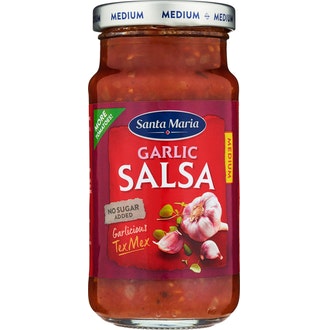 Santa Maria Garlic Salsa Medium on keskivahva salsakastike, joka maistuu selkeästi valkosipulille, tomaatille, sipulille ja chilille. Santa Maria Salsa Medium antaa meksikolaista makua tacoihin, nachoihin, burritoihin ja muihin texmex-suosikkeihin. Tämä salsa on pidetty lisuke ja dippikastike perheen illanviettoihin ja juhliin. Santa Maria Garlic Salsa sopii mainiosti myös hampurilaisiin, tortillapizzaan ja quesadilloihin.