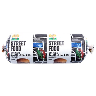 Snellman Street food burgerjauheliha 20 % 650g on valmistettu Suomessa.