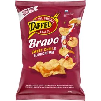 Taffel Bravo sourcream & sweet chili maustettu sipsi 130g on valmistettu Suomessa.