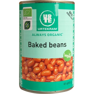 Urtekram Luomu Baked beans 400g - valkoisia papuja tomaattikastikkeessa sisältää 105 kilokaloria per 100g. Koko 400g pakkaus sisältää yhteensä 420 kcal.