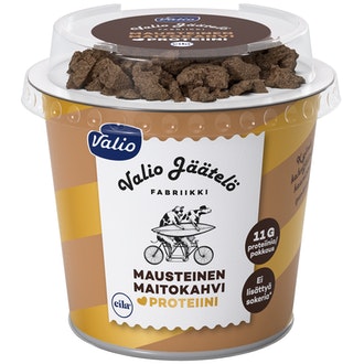 Valio proteiinijäätelö 140g mausteinen maitokahvi laktoositon on valmistettu Suomessa.
