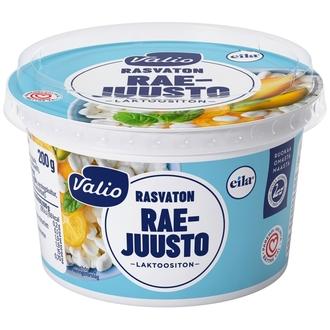 Valio raejuusto 200 g rasvaton laktoositon sisältää 69 kilokaloria per 100g. Koko 200g pakkaus sisältää yhteensä 138 kcal.