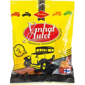 Klassiset Vanhat autot kuuluvat Halvan tunnetuimpaan brändiin. Salmiakki- ja hedelmäautot sopivat jokaiseen herkkuhetkeen. Valmistettu Pitäjänmäessä, Helsingissä.