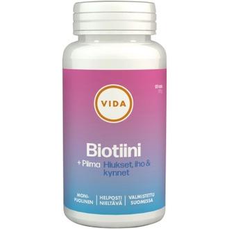 Kotimainen Vida Biotiini + Piimaa on monipuolinen valmiste hiusten ja ihon hyvinvointiin. Vida Biotiini + Piimaa valmisteessa on myös muita luuston, hiusten, ihon ja kynsien terveyden ylläpitoon tarvittavia aineita; C-vitamiinia, magnesiumia, kromia, kalsiumia ja D-vitamiinia. Lisäksi Vida Biotiini + Piimaa valmiste tukee limakalvojen hyvinvointia ja on helposti nieltävä tabletti.