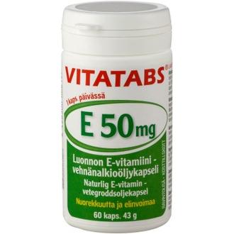 Vitatabs E 50 sisältää luontaisia E-vitamiiniyhdisteitä eli tokoferoleja, joissa on E-vitamiinia yhteensä 50 mg / kapseli. E-vitamiini on tärkeä antioksidantti, joka suojaa soluja hapettumisstressiltä antaen elimistölle elinvoimaa ja nuorekkuutta. Annostus: 1 kapseli päivässä. Laktoostion, hiivaton, makeuttamaton, gluteeniton.