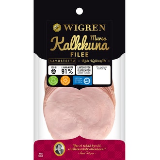 Wigren savustettu kalkkunafileleike 150g sisältää 111 kilokaloria per 100g. Koko 150g pakkaus sisältää yhteensä 167 kcal.
